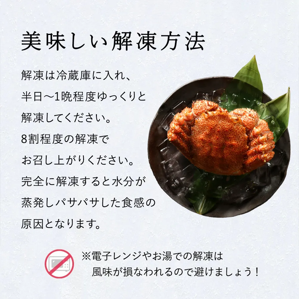 TOP カニ毛ガニ冷凍 北海道産 毛ガニ 350g~400g 【浜茹で急速冷凍 姿】 採れたての毛蟹を新鮮なうちに浜茹でに! 毛蟹 毛カニ 毛かに 毛がに カニ 蟹 価格: ¥5,880 (税込) 販売期間: 数量: 個 在庫 × 返品についての詳細はこちら 商品説明 北海道産 浜茹で毛蟹 350g~400g×1 原材料 毛蟹(北海道知床産)、食塩 ※防腐剤等の不要な添加物は一切不使用 産地 北海道産 賞味期限 お届け日より1ヶ月 ※要冷凍-18℃以下 配送について 冷凍の状態でお届け致します。※商品パッケージのデザイン・仕様は予告なく変更となる場合がございます。贈答用等でパッケージの確認をご希望される場合はお気軽にお問い合わせくださいませ。 ※ペーパーレス化のため、納品書等の金額の分かるものはお入れしておりません。