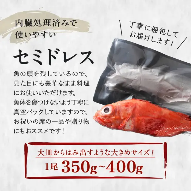 TOP 生魚キンキ キンキ セミドレス 北海道 知床・羅臼産 350g~400g 脂のり最高の高級魚! きんき メンメ めんめ お祝い ギフト 価格: ¥6,800 (税込) 販売期間: 数量: 個 在庫 ○ 返品についての詳細はこちら 商品説明 北海道産 キンキセミドレス350g〜400g×1 原材料 キンキ(北海道知床産) ※防腐剤等の不要な添加物は一切不使用 産地 北海道産 賞味期限 お届け日より3ヶ月 ※要冷凍-18℃以下 配送について 冷凍の状態でお届け致します。※商品パッケージのデザイン・仕様は予告なく変更となる場合がございます。贈答用等でパッケージの確認をご希望される場合はお気軽にお問い合わせくださいませ。 ※ペーパーレス化のため、納品書等の金額の分かるものはお入れしておりません。