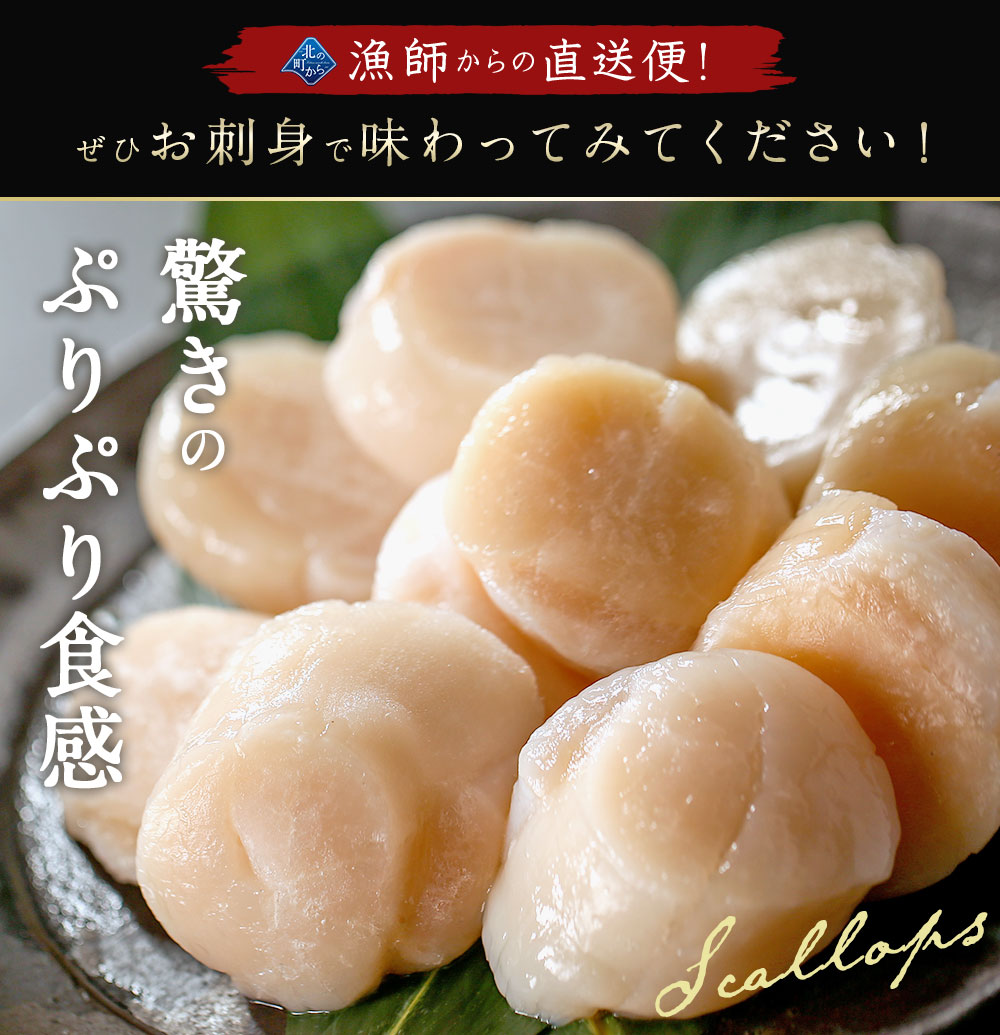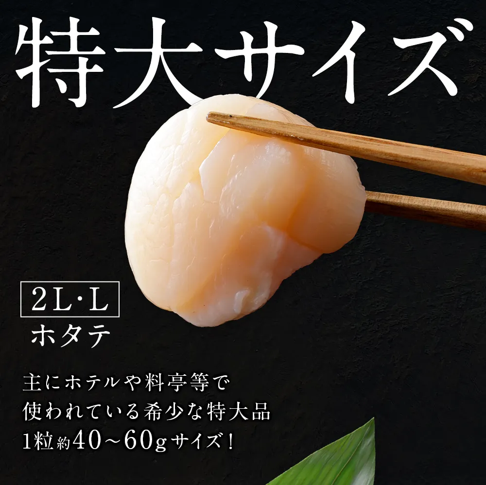| 商品説明 | 北海道産 ホタテ玉冷凍800g×1 ※特大2L・Lサイズ込。割れ、フレークは一切含みません。 |