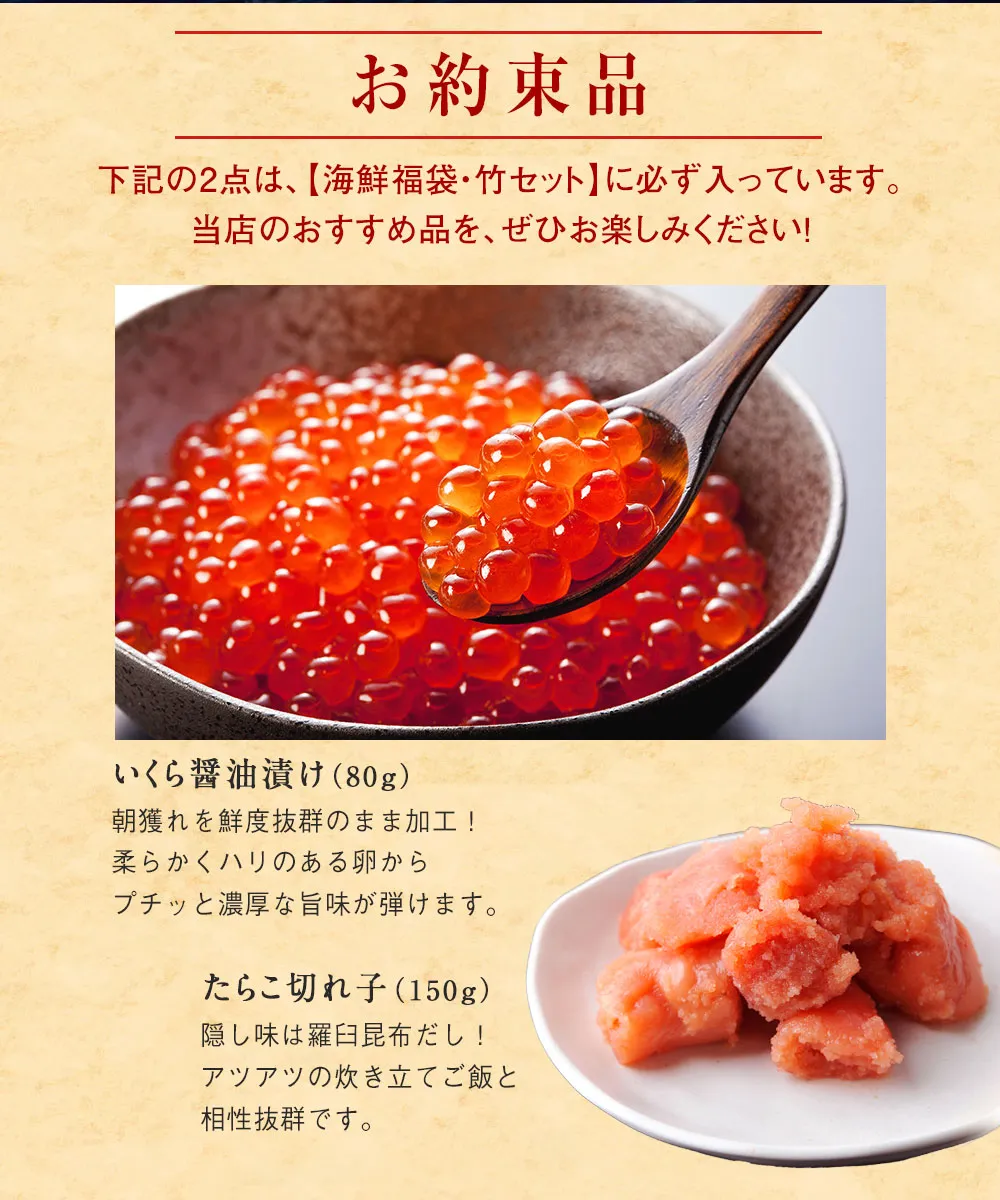 | 商品説明 | 【いくら醤油漬け】北海道産 80g×1 【たらこ(切れ子)】北海道産 150g×1 |