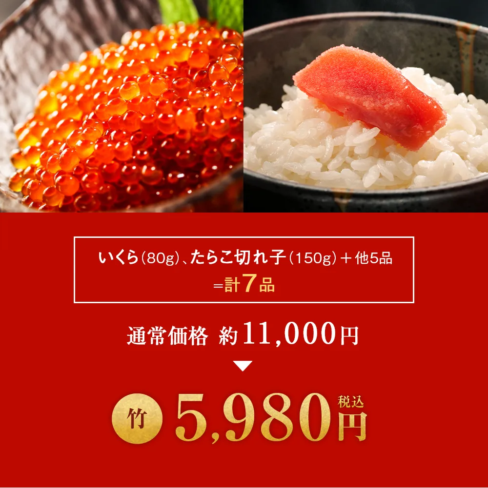 | 原材料 | 【いくら醤油漬け】鱒卵(北海道オホーツク海産)、醤油、味醂、かつお節エキス/調味料(アミノ酸等)、(一部に小麦・イクラ・大豆を含む) 【たらこ(切れ子)】助宗鱈の卵巣、食塩、発酵調味料、ソルビット、調味料(アミノ酸等)、酸化防止剤(V.C)、甘味料(甘草・ステビア)、ナイアシン、酵素、発色剤(亜硝酸Na)、着色料(赤102・黄5) |