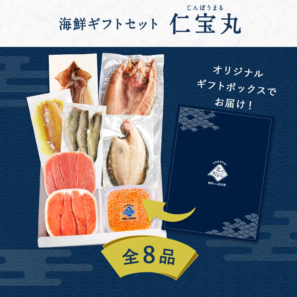 | 原材料 | 【いくら醤油漬け】鮭卵(イクラ)、醤油、米醗酵調味料、植物たん白加水分解物、還元水飴、味醂、魚介エキス、酵母エキス、調味料(アミノ酸等)、(原材料に小麦、大豆を含む) 【たらこ】助宗鱈の卵巣(アメリカ産)、食塩、発酵調味料/調味料(アミノ酸等)、ソルビット、酸化防止剤(V.C)、甘味料(甘草、ステビア)、ナイアシン、酵素、発色剤(亜硝酸Na)、着色料(赤102、黄5) 【明太子】助宗鱈の卵巣(アメリカ産)、食塩/発酵調味料、唐辛子、ソルビット、調味料(アミノ酸等)、酒精、酸化防止剤(V.C)、甘味料、発色剤(亜硝酸Na)、着色料(赤102、黄5) 【コマイ丸干し】 こまい(北海道産)、食塩 【キンキ西京漬け】キンキ(知床半島沖)、味噌(国内製造)、砂糖、甘酒、米発酵調味料、蔵造酢、食塩、醤油、魚醤、清酒、ウコン末、食物繊維、酵母エキス、白キクラゲ抽出物/増粘剤(加工デンプン、キサンタン)、(一部に小麦・オレンジ・大豆を含む) 【ナメタガレイ一夜干し】ナメタガレイ(北海道羅臼産)、塩 【ホッケ(一夜干し)】ホッケ(北海道羅臼産)、食塩 【イカ一夜干し】イカ(北海道知床産)、食塩 |
