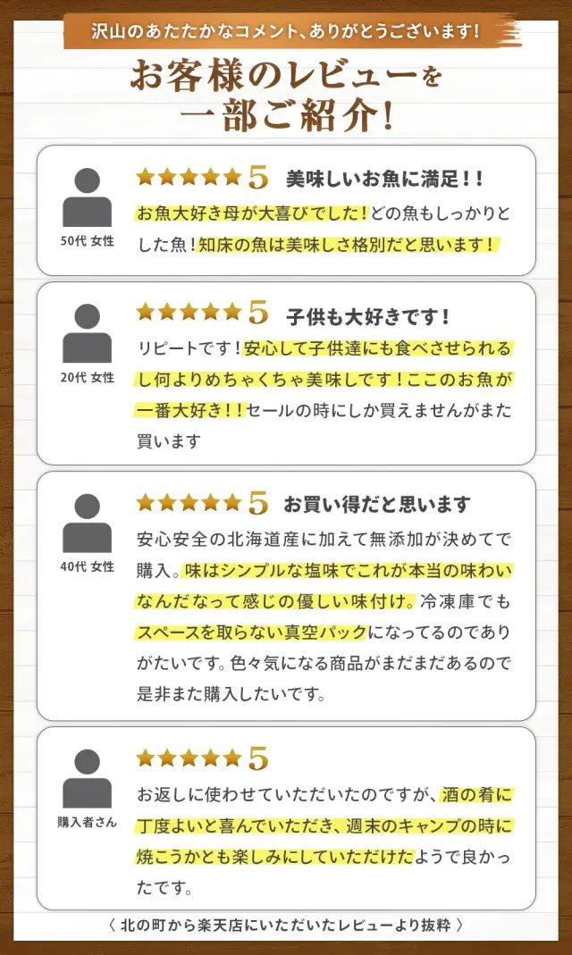 【ホッケスティック】真ホッケ(北海道羅臼産)、食塩 【ニシンスティック】ニシン(北海道知床産)、食塩 【こまい丸干し】こまい(北海道産)、食塩 【ニシン半身一夜干し】ニシン(北海道産)、食塩 【宗八カレイ一夜干し】宗八カレイ(北海道羅臼産)、食塩 【鮭ハラス塩漬け】白鮭(知床半島沖ウトロ産)、食塩 |