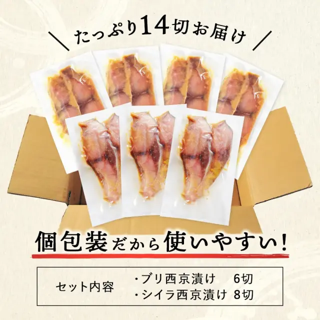| 商品説明 | 【ブリ西京漬け】6切(2切×3) 【シイラ西京漬け】 8切(2切×4) |