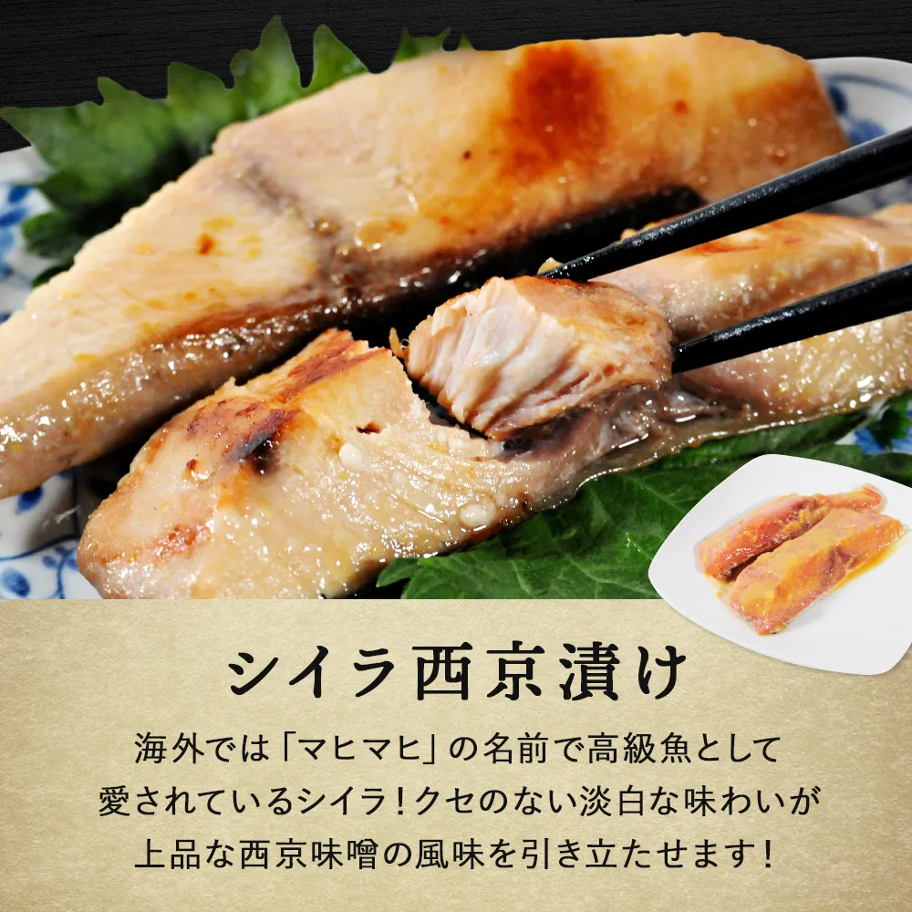 | 原材料 | 【ブリ西京漬け】ブリ(知床半島沖)、味噌(国内製造)、砂糖、甘酒、米発酵調味料、蔵造酢、食塩、醤油、魚醤、清酒、ウコン末、食物繊維、酵母エキス、白キクラゲ抽出物/増粘剤(加工デンプン、キサンタン)、(一部に小麦・オレンジ・大豆を含む) 【シイラ西京漬け】シイラ(知床半島沖)、味噌(国内製造)、砂糖、甘酒、米発酵調味料、蔵造酢、食塩、醤油、魚醤、清酒、ウコン末、食物繊維、酵母エキス、白キクラゲ抽出物/増粘剤(加工デンプン、キサンタン)、(一部に小麦・オレンジ・大豆を含む) |